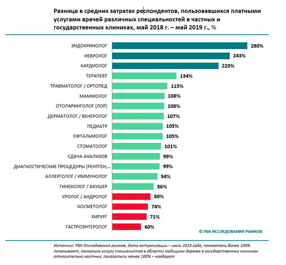 Средние затраты опрошенных жителей Московского региона в частных и государственных клиниках отличаются в зависимости от видов получаемой медицинской помощи. Средний чек в государственных клиниках выше по таким направлениям медицинских услуг, как неврология, эндокринология и кардиология. Затраты в государственном секторе выше на ₽1-3 тыс. Данное явление связано с более высокими ценами в московском регионе в целом, в том числе на платные услуги в государственном секторе. Это значит, что цены на частные и государственные платные услуги почти не отличаются между собой. В свою очередь, в частных клиниках в московском регионе пациенты больше тратят на хирургию, косметологию, гастроэнтерологию. За данные медицинские услуги в частных клиниках москвичи платят на ₽2-4 тыс. больше, чем в государственных. Стоит отметить, что по России в целом наблюдается противоположная ситуация: расходы населения на хирургические услуги в государственных клиниках выше, нежели в частных. Из этого можно сделать