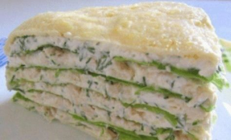 5.Выкладываем в форму: сначала белковый блин, на него – слой творога, курица, листья салата. Повторяем слой. Закрываем все белковым блинчиком.