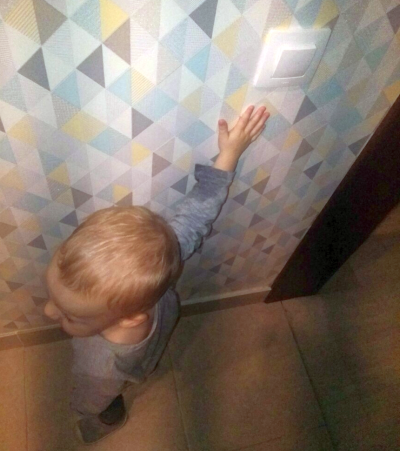 Вот как мой сын сделал свои первые шаги: он опирался на стену, и неуверенно пошёл к выключателю, его роста не хватало, чтобы дотянуться до выключателя, и он первый раз в жизни встал на цыпочки, чтобы самыми кончиками пальцев нажать заветную клавишу. Когда он ещё чуть-чуть подрос, стало понятно, что он - любитель щёлкать выключателем. Так же ему очень нравились: сетевой фильтр, кнопка на парогенераторе и кнопка подъёмника окна в машине. Плюсом вредной привычки сына стало то, что когда ребёнку становилось скучно в автокресле, жена начинала щёлкать выключателем света в машине, тогда ребёнок отвлекался на это и иногда даже начинал радоваться.