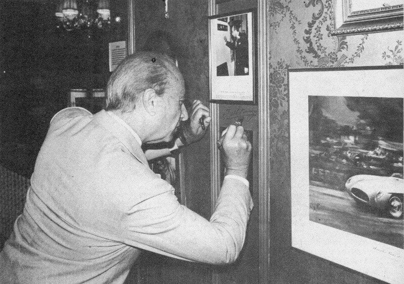 И посреди этого за одним из столиков спокойно сидел самый тихий человек из присутствующих – Фанхио. Позади него висела рамка с фотографией знаменитой массовой аварии в повороте Табак в 1950 году, сквозь которую он привел свою Alfetta к знаменитой победе. С помощью ножей, вилок и нескольких моделей машин он вновь прокладывал себе дорогу, а камеры это записывали. Когда в работе появился перерыв, я попросил его подписать мою программку. Об интервью не было и речи.