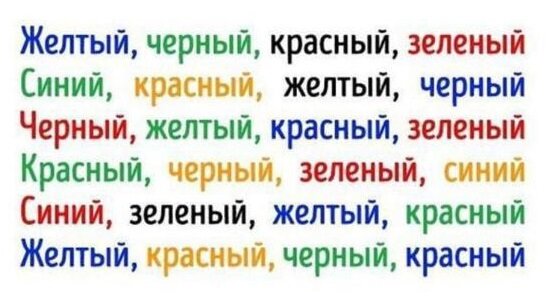 Доброго времени суток! Предлагаю вновь проверить себя на внимательность и память. Задание такое: произнесите вслух цвета, которым написано слово по цепочке. Дойдя до последнего слова повторите чтение в обратном порядке. Кажется легко, а Вы попробуйте!!! Оказалось не так уж и легко, не правда ли?! Все дело в том, что одно полушарие нашего мозга диктует нам цвет, а второе само слово. Отличная тренировка головного мозга!!! И что немаловажно, такие тренировки предотвращают болезнь Альцгеймера! Это мой Мир_ОК, но он может стать нашим. Подписывайтесь и не скупитесь на лайки!