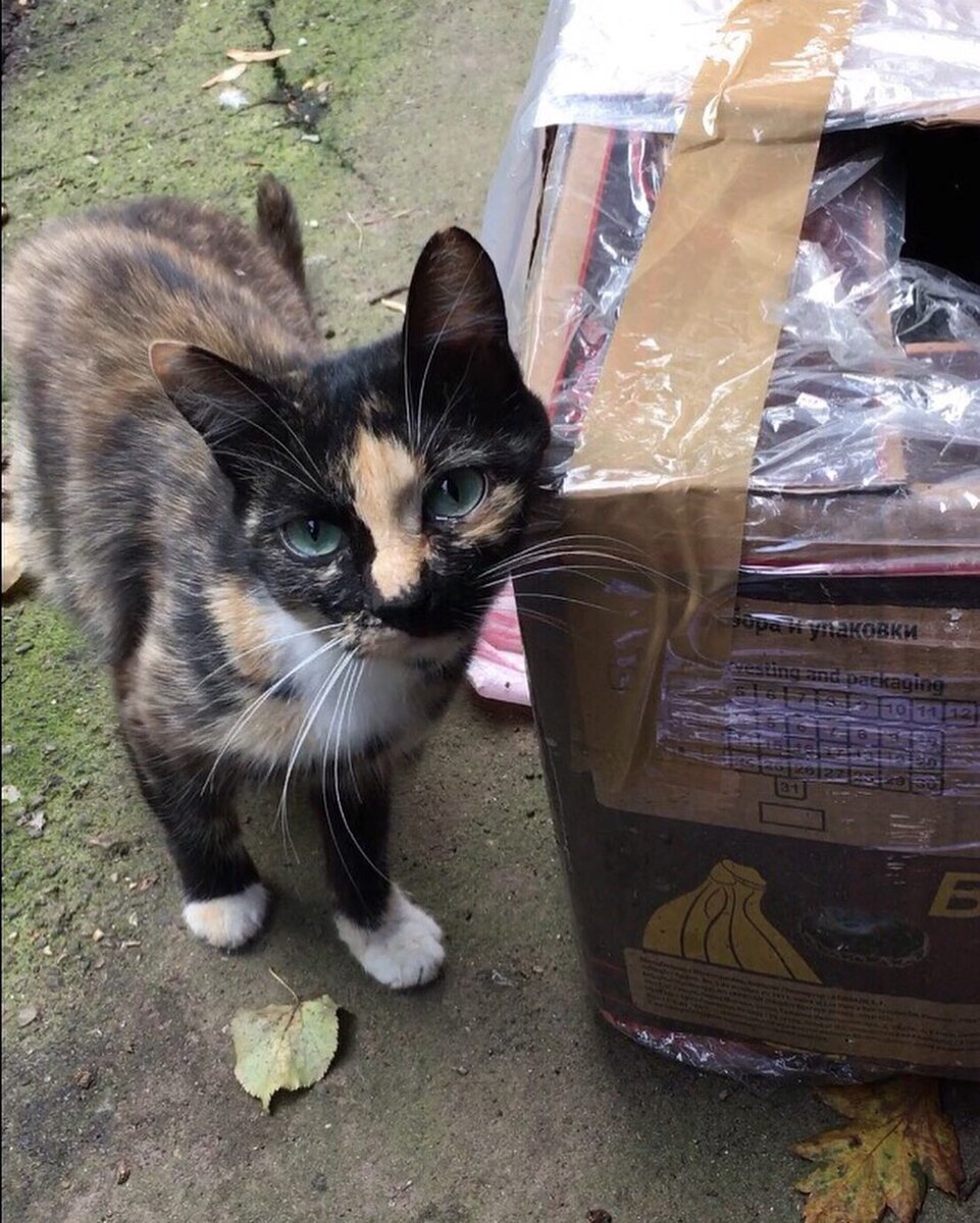 Разноцветная, голубоглазая, в белых носочках на грязной земле. Сколько их таких по российским городам и весям. Но в крупных городах им особенно сложно, новостройки совсем не имеют лазов в подвал, а в старых домах управляющие компании всё аккуратно закрыли решетками. И люди уже бьют тревогу, города захватили крысы, и если кошки не могут найти лаз в подвал новостроек, то крысы прекрасно его находят. Но наш рассказ не об этом. Наш рассказ о кошке из Подмосковья, о молодой, совсем недавно ставшей мамой, и живущей в коробке. Котят забрали волонтеры, а кошку забрать некуда, не так то легко найти дом взрослой кошке, все хотят котенка. К сожалению, спасти разноцветную малышку (с фотографии с кошкой) не удалось, глистная инвазия, анемия, смерть. Осталась мама в коробке на улице и черный малыш на передержке. Кошечке проведут стерилизацию и, после 4 дней стационара, она будет выпущена во двор. Может быть за это время её и заметит кто-то, и кошка из коробки вдруг станет домашней и любимой.