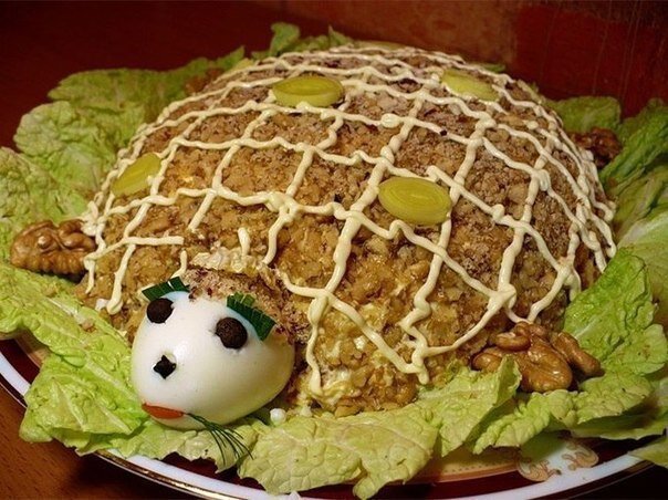 На плоское блюдо кладём листья салата. Располагаем с краю яйцо, которое будет головой черепахи. Половину курицы, заправленной майонезом, выкладываем, формируя туловище. Посыпаем курицу луком, смазывать майонезом не нужно. Следующий слой - белок яйца, промазываем майонезом, затем - яблоки. Выкладываем вторую половину курицы, промазываем майонезом, сверху выкладываем слой желтками и также промазываем майонезом. Распределяем по желтку чернослив. Завершаем слоем сыра.