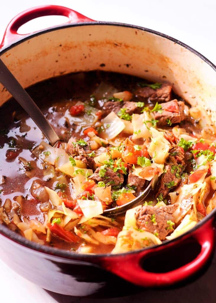 Домашний суп из капусты и говядины - идеальная еда! Его легко приготовить, он наполнен кусочками говядины, морковью, помидорами и большим количеством специй и трав. Этот сытный суп готовится за 35 минут и идеально подходит для насыщенных будних вечеров!