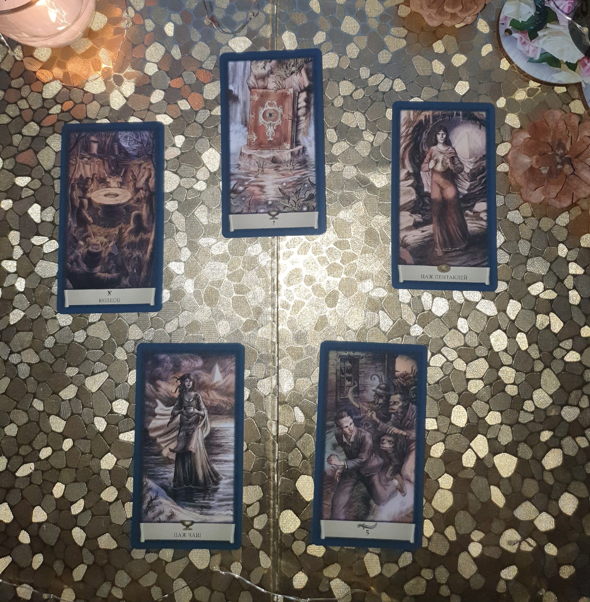 Расклад на новый путь, цель, желание. Прошлое, что мешает. Вероятное развитие, препятствия, трудности и совет.