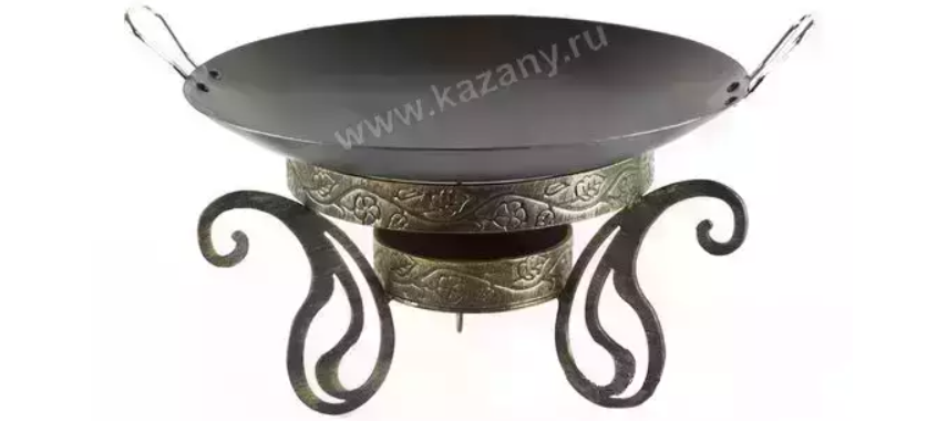 Предусмотрены две удобные ручки сквозного крепления, что обеспечивает безопасность использования. Благодаря большому диаметру можно быстро накормить семью или большую компанию друзей. В комплекте идет кованая вручную подставка с национальным азербайджанским узором бута и растительным орнаментом. Встроенная емкость предназначена для углей или свечей, которые позволят сохранить блюда горячими.