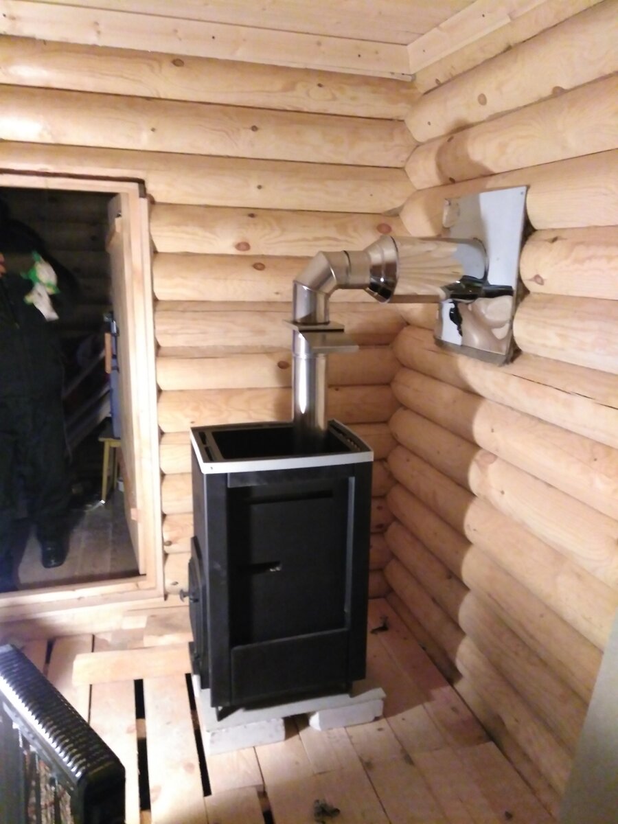 Про дымоход: Дымоход проложил безопасным методом - через улицу. Схема дымохода: печь, полметра стартовой трубы, потом поворотный элемент 90°, переходник на метровую сендвич-трубу, противопожарный узел, дальше метровая сендвич-труба с тройником под 45°, тройник - на крепёж выполненный из монтажной траверсы все это мы с другом сделали за один день. Дальше собирал 2,5м сендвич-трубы на земле, поднимал наверх и крепил ее на боковые опоры из профильной трубы. Сами боковые опоры крепились на металлические уголки.