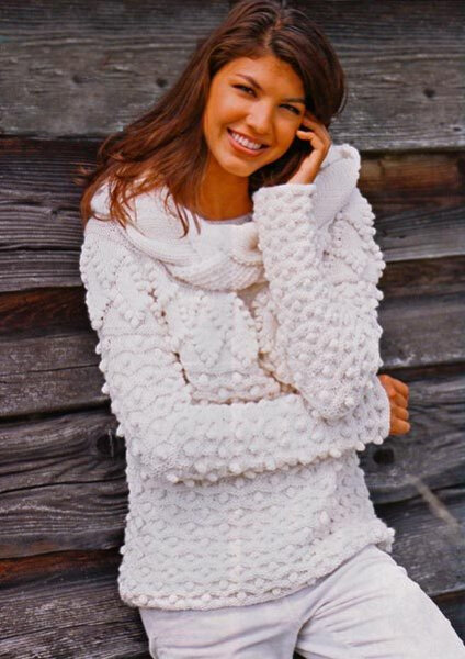 Этот чудесный светлый зимний пуловер вяжется спицами. Прекрасно согреет в холода, украсит фигуру, да и вообще, сделает вас неотразимой. Я уверена в этом ? Так хочется, чтобы тобою восхищались и замечали, а ведь это так просто, если вяжешь для себя эксклюзивные вещи сама. Такого пуловера не будет ни у кого, всегда уникальна, всегда элегантна и красива!