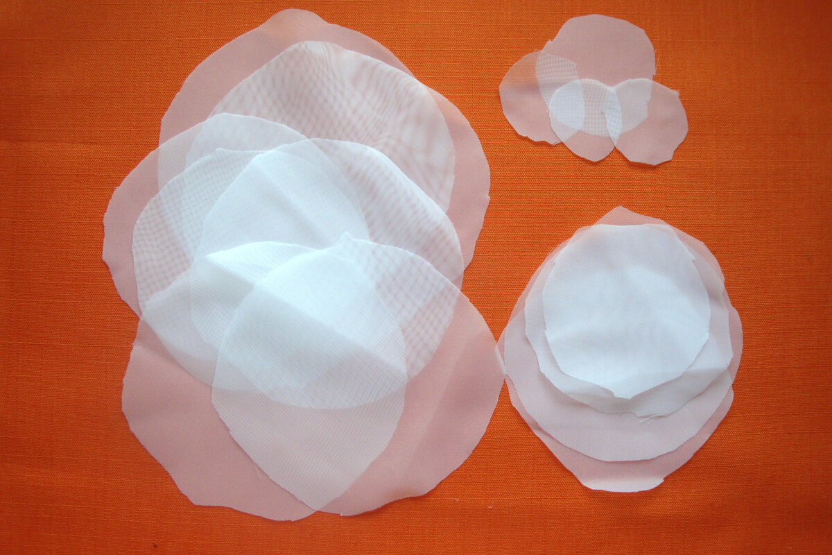 Здесь ткань цветная, и я оставила потемневший край. Мне показалось, с ним даже красивее! :) Вот тут как раз кружочки нанизаны не по центру, а со сдвигом. Будете делать, поэкспериментируйте. Мне захотелось, чтобы были ещё и листики, я и вырезала их. :) Тоже опалила и подшила снизу. Основа из ткани прикрывает "начало" листиков. Про бутоны в другой раз расскажу. :)