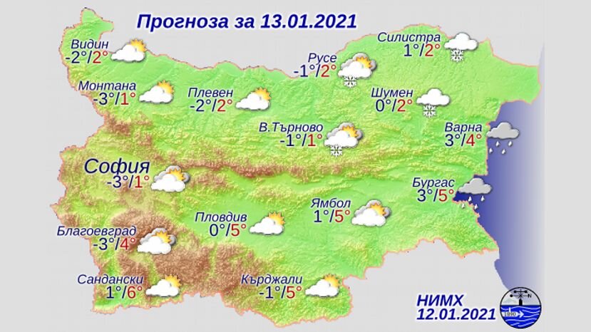 Ночью осадки с запада начнут прекращаться. Минимальная температура будет между минус 4° и 1°. Днем с утра в восточных районах дожди продолжат идти, на местах дождь перейдет в снег. Над остальной частью страны будет переменная облачность, почти без осадков. Максимальная температура будет между 1° и 6°...Прогноз погоды в Болгарии на 13 января