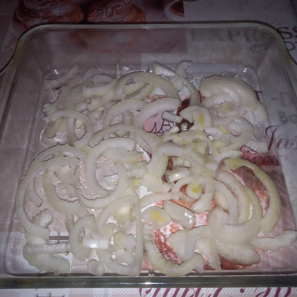 Форму для запекания смазываю растительным маслом и укладываю на дно нарезанный полукольцами репчатый лук.