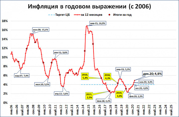 ЦБ явно промахнулся и с прогнозами (он ожидал 3,8-4%), и со своими действиями, на этих прогнозах основанными. Имеется в виду снижение ставки: многократное, поспешное и, как сейчас выясняется, ошибочное.