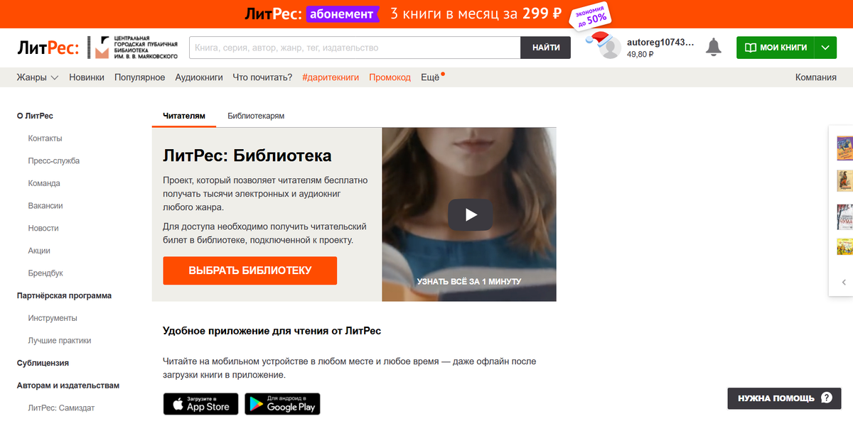 Несколько лет назад ЛитРес запустил проект «Библиотека». Если у вас есть читательский билет в одной из российских государственных библиотек, а у библиотеки в свою очередь заключен договор с ЛитРес, то вы можете получить специальный логин и пароль. Войдя под ним на ЛитРес, вы получаете доступ ко всем книгам, которые ваша библиотека выбрала для своего каталога. И самое главное – вы можете читать их абсолютно бесплатно! Есть только несколько ограничений: