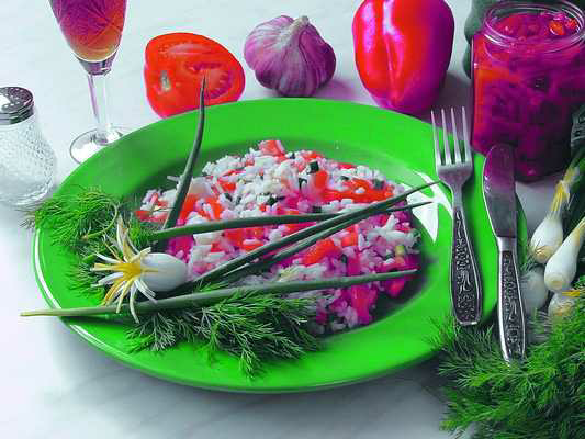 7. Нарезанные овощи поместить в глубокую емкость, добавить рис, все перемешать.
