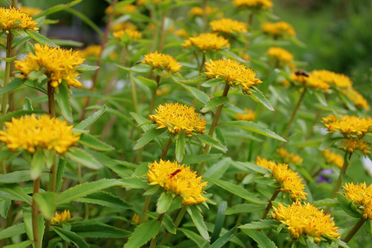 Седум живучий или Очиток живучий - самый любимый пчёлами. Высота ароматного седума живучего 20-45 см, а зацветает он в в конце июня и цветёт по июль, привлекая к себе большое количество шмелей и пчёлок. Растение очень неприхотливое, предпочитает солнце, но можно сажать и в полутени. Будет расти на любой почве без застоя воды.