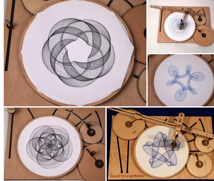 Машина для рисования циклоидов - замечательная штуковина с довольно труднопроизносимым названием, но с простой и гениальной идеей: она использует ту же концепцию, что и спирограф вашего детства, но пластик уступает место остроумной системе наконечников, кривошипов и деревянных рычагов.