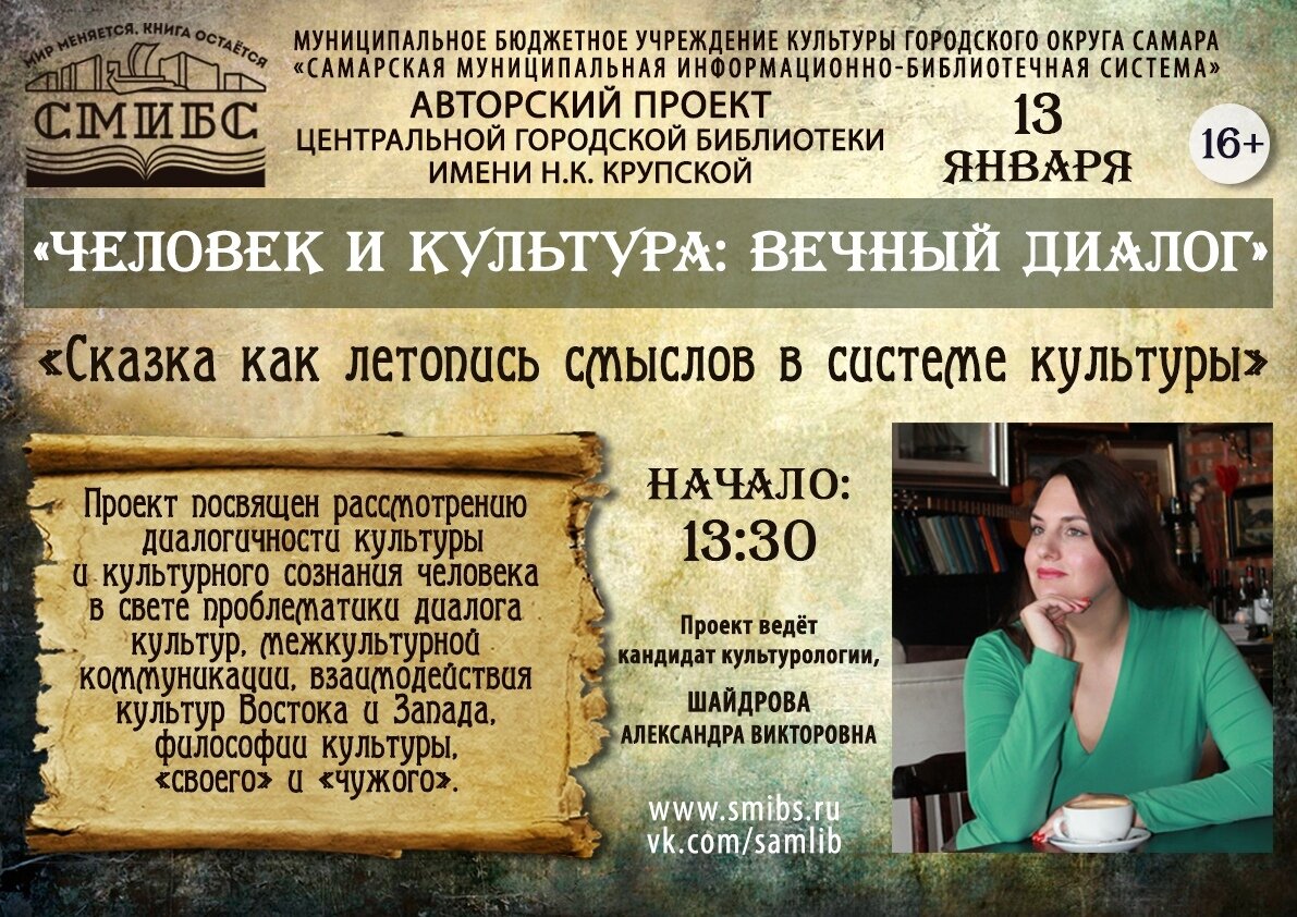 13 января в 13:30 приглашаем вас на просмотр онлайн-лекции «Сказка как летопись смыслов в системе культуры» в рамках проекта Человек и культура: вечный диалог