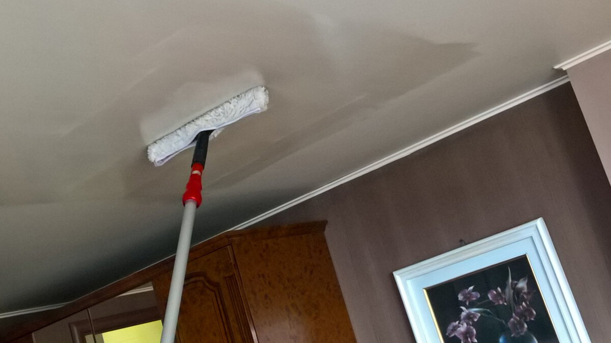 Так как все натяжные потолки имеют свойства отталкивать воду, не нужно сильно мочить шубку, достаточно сделать ее слегка влажной. Поскольку сильно мокрая шубка даст множество разводов.