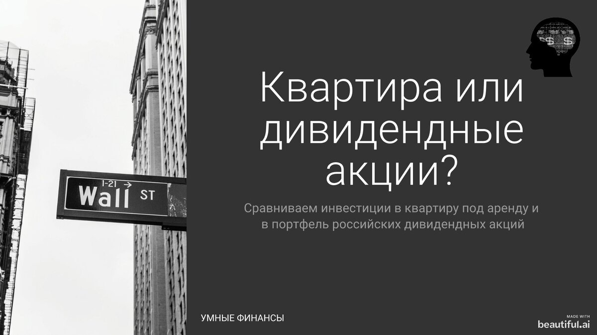 Допустим, у вас есть 50 тысяч рублей в месяц, которые вы хотите вложить так, чтобы начать получать пассивный доход. И вы хотите понять, что реально выгоднее — взять квартиру в кредит, чтобы её сдавать, или же вложиться в дивидендные акции. (Альтернативно: в облигации, есть свои плюсы и минусы, но об этом как-нибудь в другой раз.)