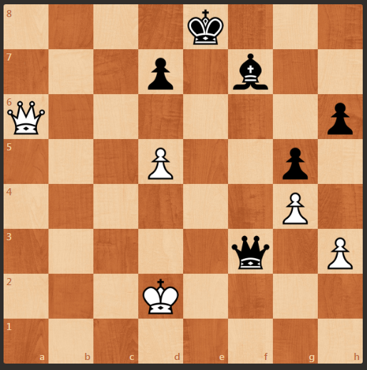Очередная шахматная задача. Черные имеют лишнего слона. Так же черные напали ферзем на две белые пешки. Однако белые начинают и выигрывают (получают материальный перевес).