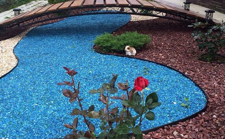 Разноцветным щебнем можно украсить дно аквариума, оригинально и ярко декорировать стены в помещении, оформить самобытные садовые дорожки и аллеи.