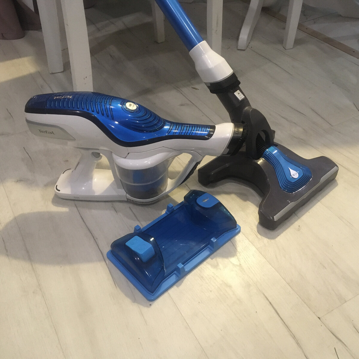 - Он беспроводной: это и плюс и минус. Наша квартира около 90 квадратных метров — мне хватает на одну очень тщательную уборку (с коврами и мебелью) или на две обычных влажных. Однако я просто постоянно храню его на зарядке и в общем-то нехватки аккумулятора не замечаю.
