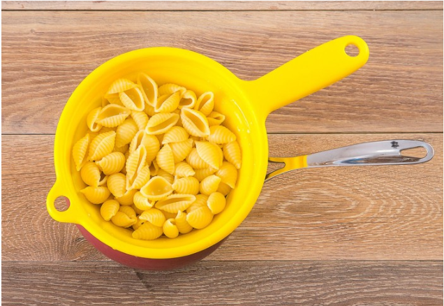 Разложите индейку с овощами в сметанно-горчичном соусе по тарелкам, рядом выложите ракушки и подавайте.