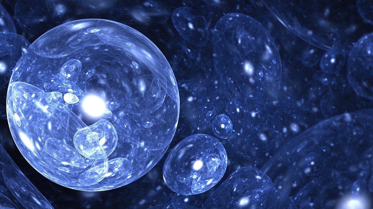 Выше — изображение пузырей Вселенной художником. У каждого пузыря есть своя собственная система координат со своим временны́м измерением. Эта иллюстрация помогает лучше понять, почему наблюдаемая Вселенная не обязательно должна быть окончательной. Мы — лишь один пузырёк среди моря других пузырей, каждый из которых имеет свое «время».