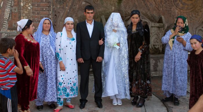 Традиционные свадебные наряды очень яркие и колоритные. Украшенные золотыми нитями и драгоценностями они выглядят особенно торжественно. Обязательным предметом наряда является паранджа – головной убор невесты. Он символизирует скромность и благочестие невесты. Одежда жениха состоит из вышитого золотом чапана (национального халата) и тюбетейки. После одевания невесты подруги устраивают ритуальные танцы и песни, объявляя о согласии новобрачной на проведение бракосочетания. Мулла проводит священный обряд никах, все родные и гости поздравляют жениха и невесту. Затем молодые едут в ЗАГС узаконить юридически свою семью.