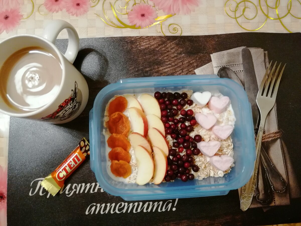 На завтрак кофе с молоком и ленивая овсянка. Приготовила её с вечера. Сверху курага, яблочко, клюква и маошмеллоу. И маленькая конфетка.