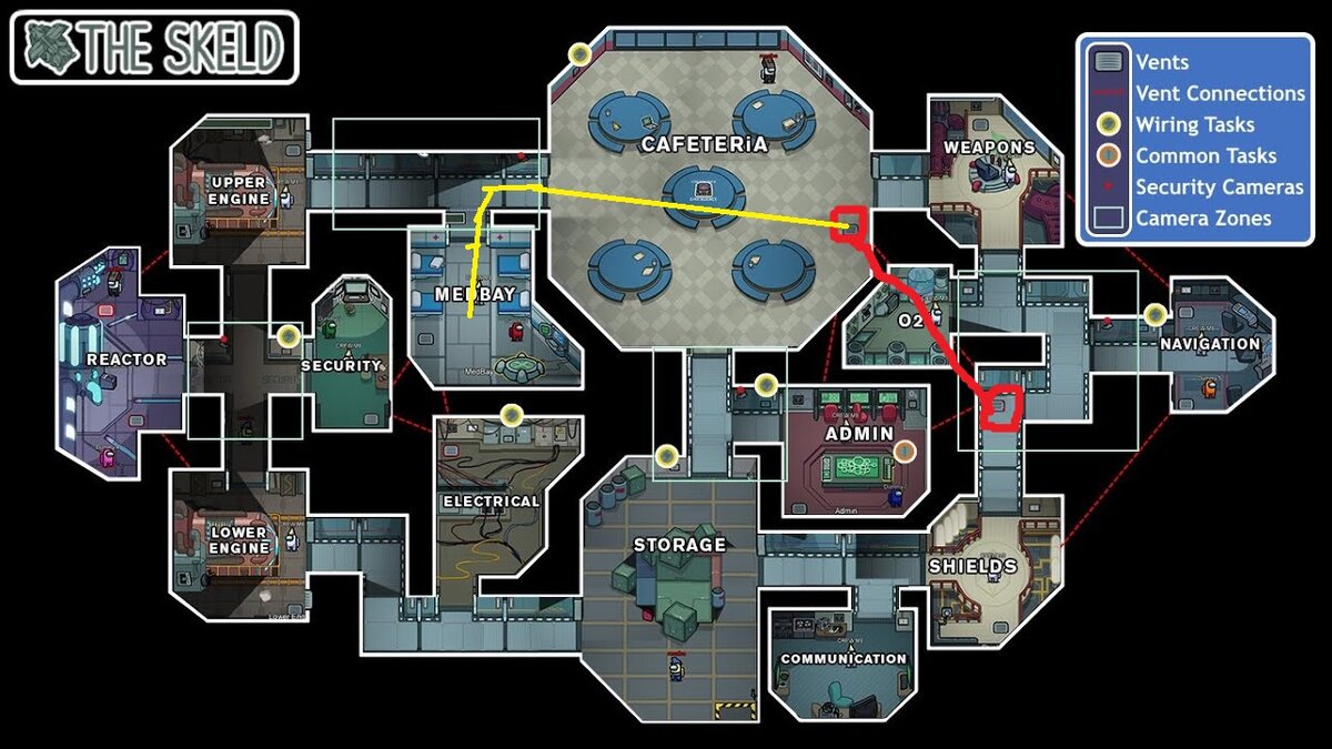 Начинается с камер , нужно помнить радиус их просмотра . На рисунке выше всё показано белыми рамочками , как видит камера. Самые лучшие места для убийства считаются: столовая (только после убийства надо бежать в оружейную) хранилище , коммуникации , щиты , верхние и нижние двигатели , электричество , 02 и оружейная. Остальные комнаты находятся рядом с камерами и считаются небезопасными