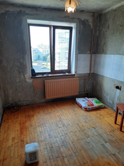 После высыхания штукатурки, стены полностью зашпаклевали финишной шпаклевкой. Шпаклевка убирает мелкие недочеты стен, а также делает их однородными по цвету, чтобы обои не просвечивали.