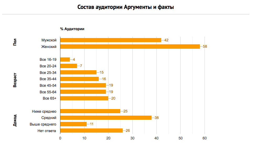 По данным TNS NRS ((National Readership Survey)- Россия на декабрь 2013- апрель 2014 аудитория «АиФ» составляла 6 547 500 человек. Ниже приведу статистические данные об аудитории «АиФ» (2)