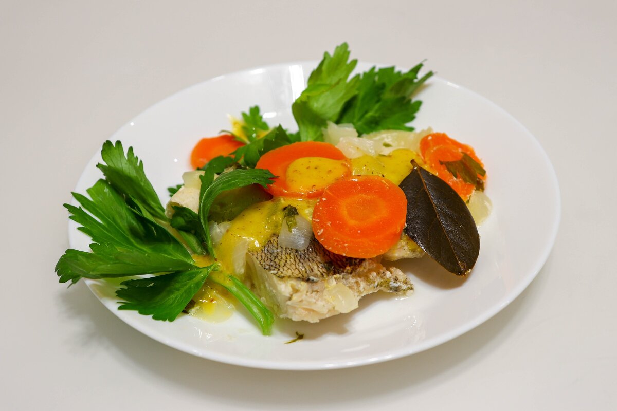 Приготовить же вкусные рыбные блюда не составит труда, если знать некоторые хитрости. Я всегда рекомендую вам рецепты блюд, которые можно быстро и несложно приготовить. Вкусно – это не обязательно долго и сложно. Приготовить ароматное и вкуснейшее блюдо из судака можно за 30 минут, а подчеркнуть и улучшить его вкус нам поможет соус. Один из несложных, но отличных соусов для рыбы – это соус Айоли. Он очень популярен на побережье Испании, Италии, Франции, и идеально подходит для рыбы и овощей. Для приготовления рыбы и соуса нам понадобятся: Филе судака – 500 грамм Морковь – 1 Лук – 1 головка Лимон – ½ Листья сельдерея Лавровый лист - 2 Чеснок – 1 зубец Яичный желток – 2 Горчица – 1/2 чайная ложка Оливковое масло - 150 грамм Чёрный перец молотый Чёрный перец горох – 1 чайная ложка Соль 1. Нарежьте полукольцами лук, кольцами морковь и сельдерей. 2. Натрит