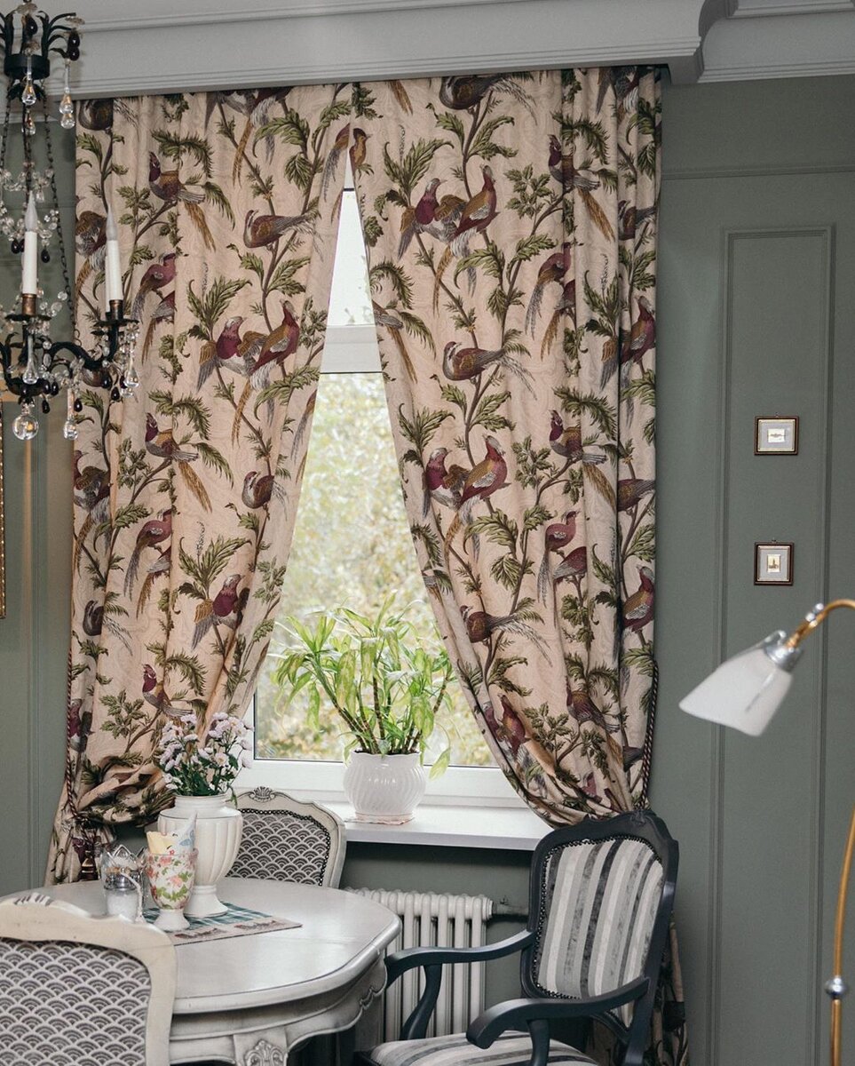 И после завершения работ гостиная стала таковой. Пространство небольшой комнаты получилось насыщенным и акцентным, и при этом выглядит гармоничным, сдержанным и уютным. Центральным ярким штрихом стали портьеры с интересным "птичьим" принтом и подхватами. Сама ткань выглядит очень яркой и пестрой, но при этом совсем не перегружает интерьер, а органично дополняет его.