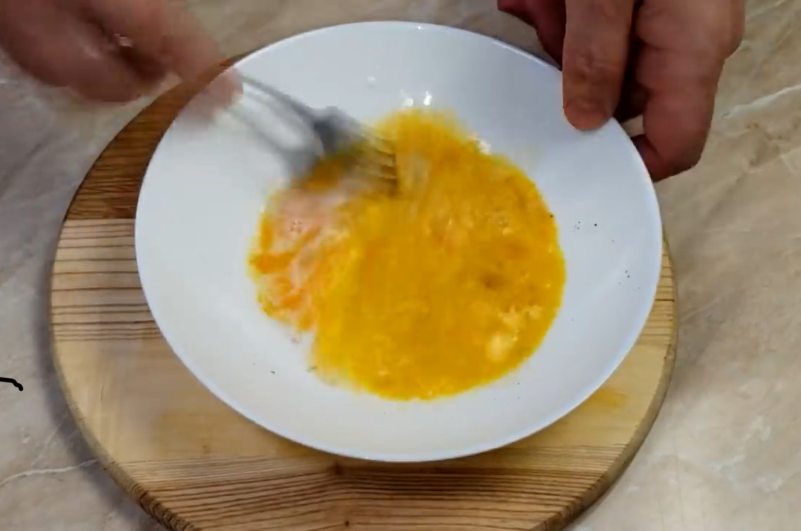 Разбиваем в тарелку одно куриное яйцо, добавляем соль и перец по вкусу, добавляем одну столовую ложку молока и взбиваем до однородной массы.
