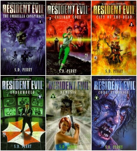 Официальной новеллизацией серии по играм RE занималась американская писательница Стефани Перри. Её перу, кстати, принадлежат не только книги по Resident Evil, но и фанфики по франшизе "Чужой". Новеллизация была одобрена самой компанией-разработчиками Capcom. Основная часть книг писалась в 2001 году, когда самой свежей игрой серии была Resident Evil: Code Veronica. Тогда серия насчитывала 6 книг: "Заговор корпорации Амбрелла";"Город мёртвых";"Немезис","Код Вероника"(новеллизации непосредственно игр); "Бухта Калибан" и "Подземелье"(творческий вымысел Перри). В 2013 году была выпущена последняя(а по хронологии событий - первая) книга "Нулевой час", которая являлась новеллизацией Resident Evil Zero. В отличие от фильмов по RE, где изначально была рассказана совершенно другая история, книги до поры до времени во многом следовали событиям серии игр. Разница, как говорится, в деталях.