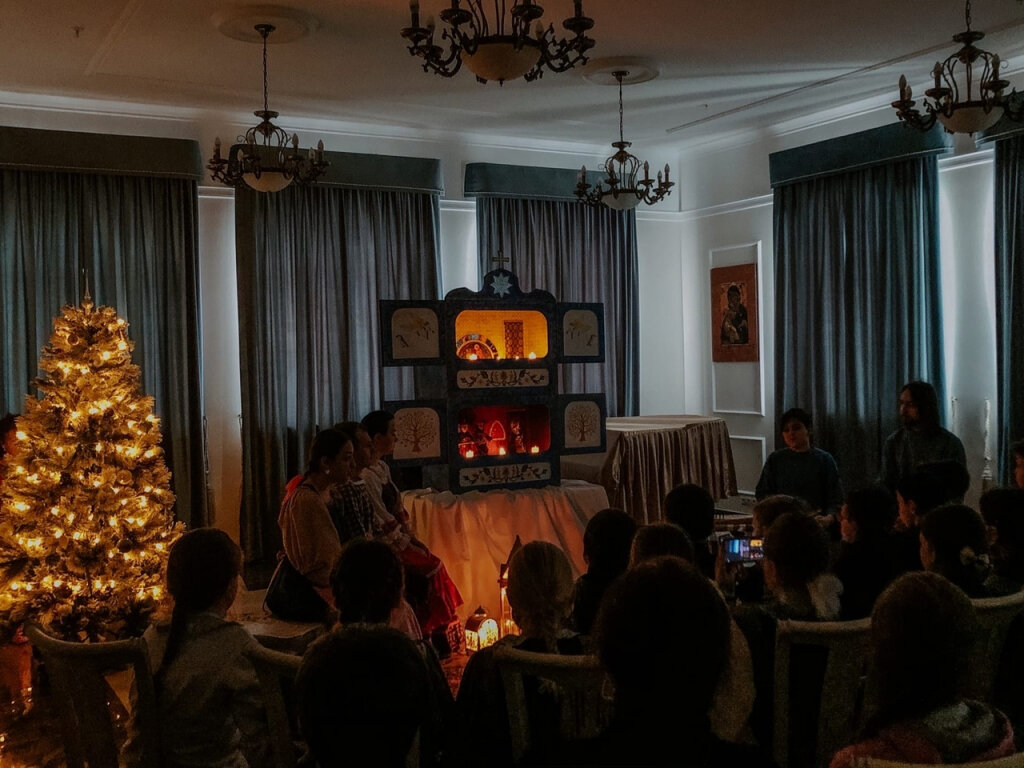 Перед зрителями было разыграно рождественское представление при помощи кукол в специальном ящике, который и называют вертепом. Рождественский вертеп — это модель Вифлеемской пещеры, в которой родился младенец Иисус. Для вертепного театра были использованы традиционный сюжет и персонажи: ангелы, славящие Рождество Христово, пастухи и волхвы, поклоняющиеся Младенцу Иисусу. Затем на нижнем ярусе разыгралась история избиения младенцев, смерти царя Ирода. Актеры постарались донести библейскую историю во всей ее непосредственности, привлекая детей к сопереживанию и участию. Каждый ребенок держал в руках ангела, которого изготовил самостоятельно на мастер-классе под руководством студентов, занимающихся в фольклорно-этнографической лаборатории.