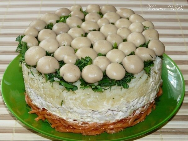 Укладываем наш салат в глубокую ёмкость, сначала грибы (вниз шляпками), затем зелень (мелко рубленную), картофель (отварить, натереть на крупной тёрке), куриную грудку (отварить, мелко порезать), корейскую морковь. Все слои смазать майонезом и поставить на пару часиков для пропитки. Затем переворачиваем нашу ёмкость на тарелку и получается КРАСОТА!!!!!!!