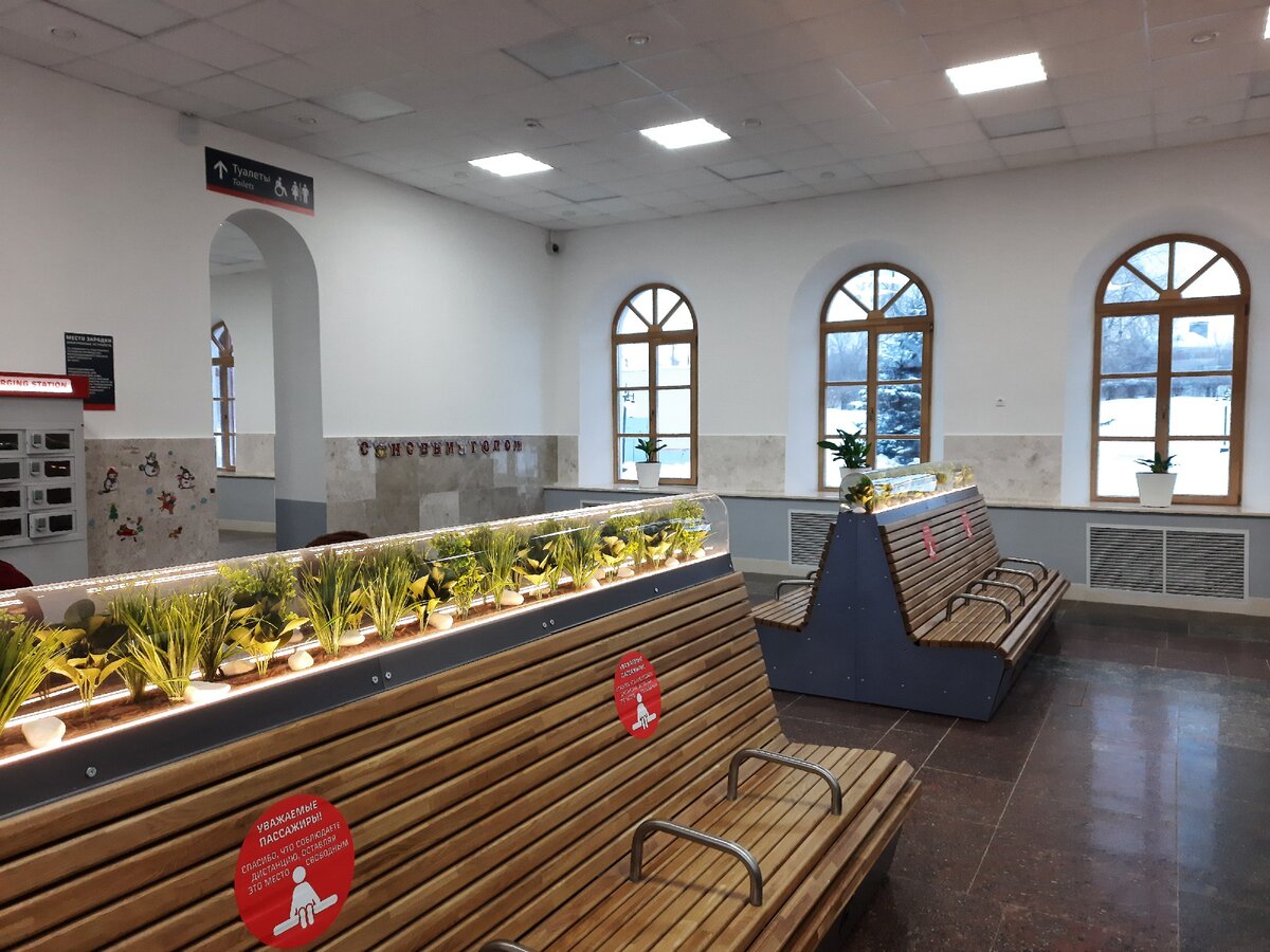 Вокзал недавно хорошо отремонтировали, поставили новые скамейки и украсили их растениями: они искусственные, зато они есть.