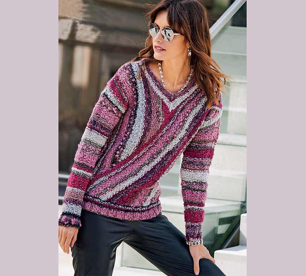 Эффект запаха в модели возникает благодаря диагональному крою переда. Пряжа секционного крашения, жемчужный узор и обычная резинка создают красивые рельефные полосы. Размеры: 36 (38/40) 42/44. Вам потребуется: пряжа (67% шерсти, 18% вискозы, 15% полиамида; 100 м/ 50 г) - 400 (450) 500 г розово-серой секционного крашения; спицы №6; круговые спицы №6; маркер петель. УЗОРЫ Резинка А 2 х 2: число петель кратно 4 + 2 кромочные. Начинать и заканчивать ряд 1 лиц. Резинка В 2 х 2: число петель кратно 4 + 2 + 2 кромочные. Попеременно 2 лиц., 2 изн. Жемчужный узор: четное число петель. Лицевые и изнаночные ряды: кромочная, попеременно 1 лицевая, 1 изнаночная, кромочная. Платочная вязка. Рельефный узор: начать с 1 лицевого ряда. * 1 р. лицевыми, 3 р. жемчужным узором, 2 р. резинкой А или В (согл. инструкции), 2 р. платочной вязкой, от * постоянно повторять Плотность вязания: 12 п. х 25 р. = 10 х 10 см - рельефным узором. Внимание: перед вязать поперек из 2 частей. Стрелки на выкройке = направлен