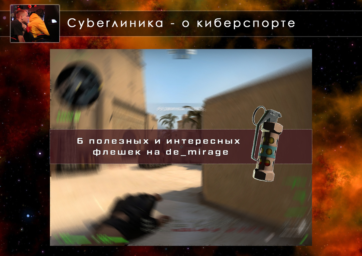 Доброго времени суток, дорогие друзья. Делал статьи про световые гранаты на de_dust2 и de_inferno. А про одну из самых популярных карт совсем позабыл. Вашему вниманию: 6 полезных и интересных флешек на de_mirage.