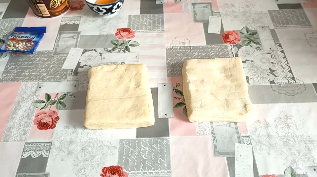 Выпечка в виде ёлки для рождественского стола. Делается просто, выпекается быстро, ингредиенты самые обычные. Главное, заранее достать из морозильной камеры слоеное тесто. Продукты: 500 грамм слоеного теста, шоколадная паста по вкусу, 40-50 грамм грецких орехов или арахиса, желток одного яйца, посыпка.