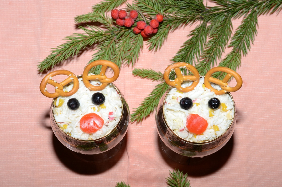 3. Выложить салат в порционные салатники или бокалы. Сверху посыпать белками. Вырезать из болгарского перца кружочки - носики оленей. С печенья Brezel сделать рога. Глаза - из маслин или изюма.