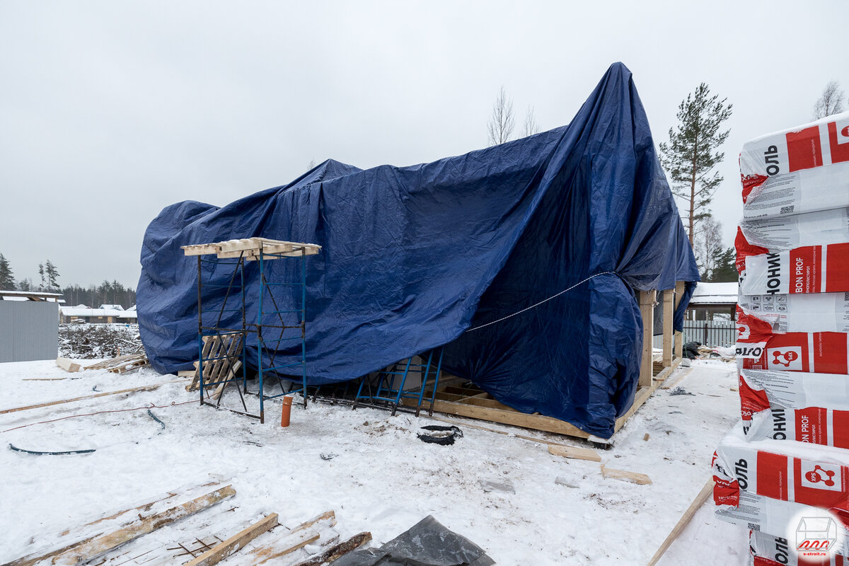 К Новому Году на стройке в Песках не так много нового: закончен каркас террасы, установлены столбы из клееного бруса, стропила, сделан настил из фанеры, а на крыше самого дома появился парапет. Правда увидеть это не так просто :)