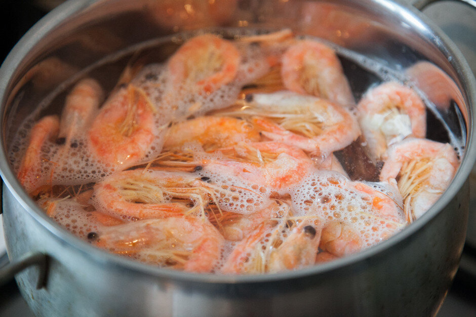 Варке подлежит только свежемороженный продукт. Варить креветки, заготовленные варено-мороженным способом, не нужно. Они уже готовы к употреблению, нужно только разморозить их, а для придания вкуса и подогрева ошпарить горячим рассолом.