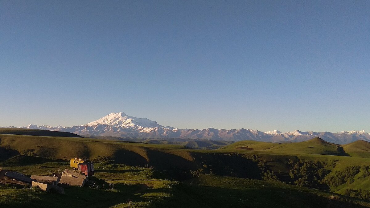 Возвращаюсь домой уже на закате и Эльбрус показывает мне свой подрумяненный солнцем бок.