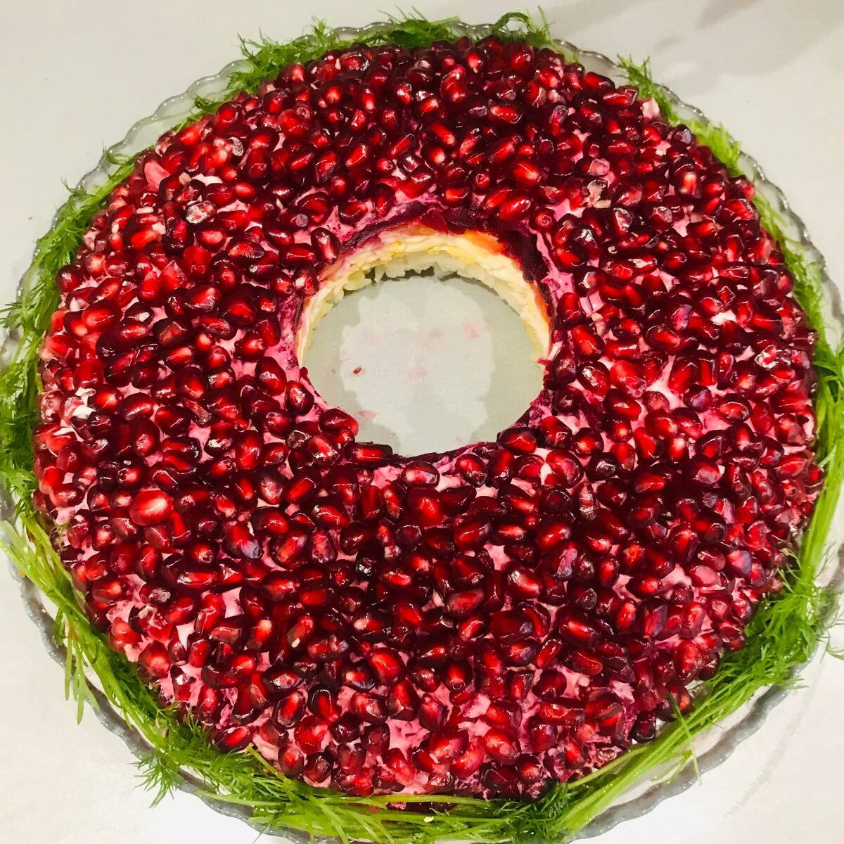 В конце убираем стакан и получаем форму напоминающую браслет. Но так как стол у нас новогодний,я украсила края блюда веточками укропа и получилось что-то наподобие новогоднего венка.
