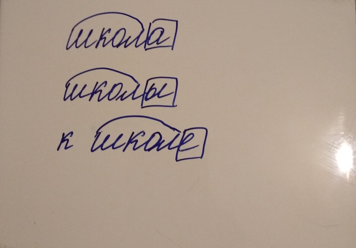 Попросите ребенка записать слово школа. А дальше измените это слово по вопросам. С формой слова знакомятся во 2 - 3 классе (зависит от программы). Дети ещё не знают про падежи. Поэтому просто поможем ребенку изменить слово по вопросам.