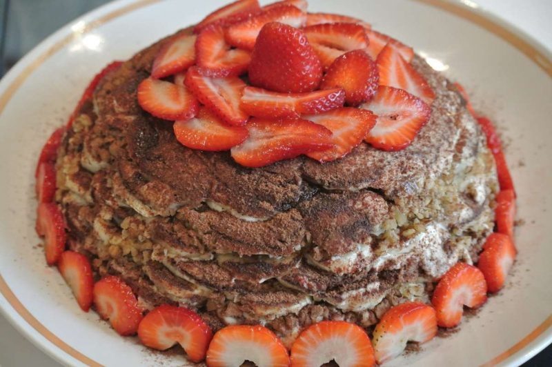 Слои можно посыпать молотыми орехами, свежими или консервированными ягодами, порезанными тонкими кусочками фруктов. Их лучше выбирать с кислинкой, чтобы торт не был слишком сладким. Изменяя ингредиенты, каждый раз можно получать новый вкус.